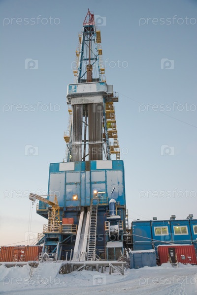 Бурение глубокой скважины с помощью буровой установки на месторождении нефти и газа. Месторождение расположено на Крайнем Севере за Полярным кругом. Съемки проводились зимой во время полярного дня
