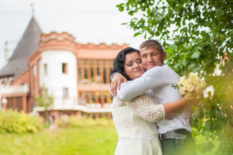 Жених и невеста крепко-крепко обнимаются на свадебной фотосессии