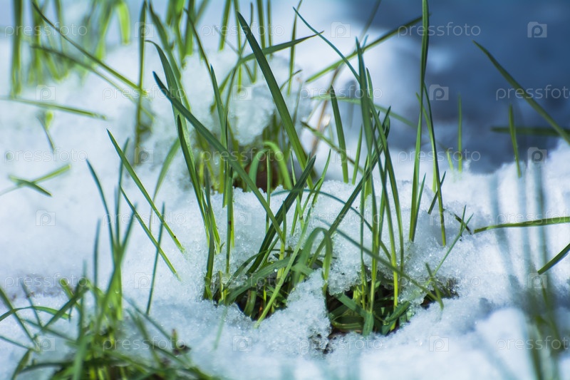 Весенние зеленые листья под снегом, мороз