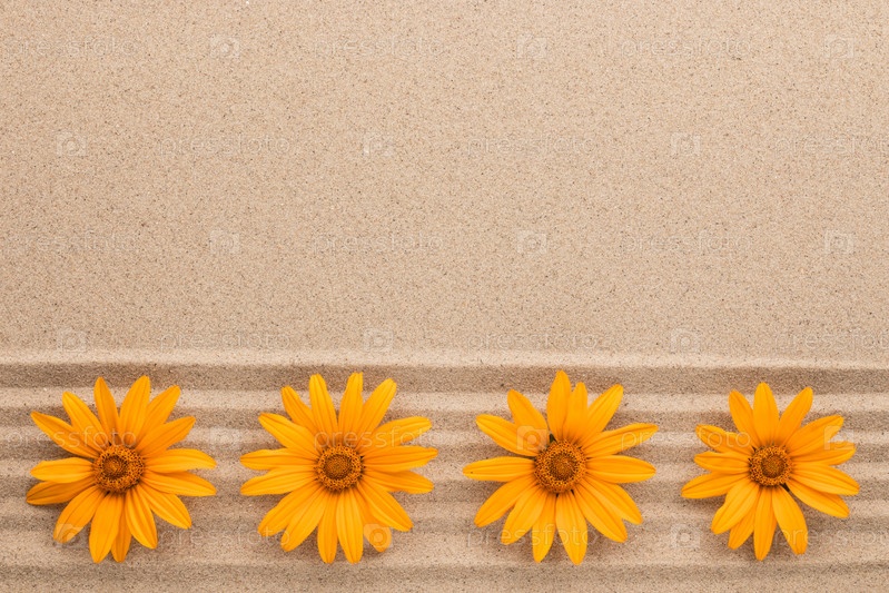 Ряд желтых маргариток, лежащих на песчаных линиях, с местом для текста
