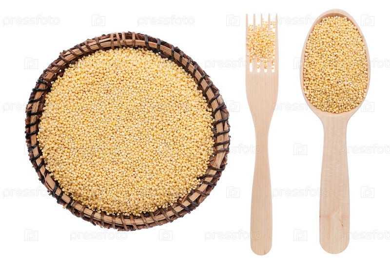 Пшено в тарелке, вилке и ложке