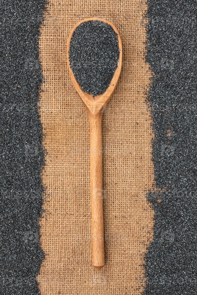 Деревянная ложка с маком лежит на мешковине