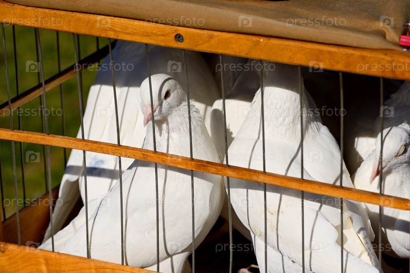Несколько белых голубей сидят в деревянной клетке. Крупным планом