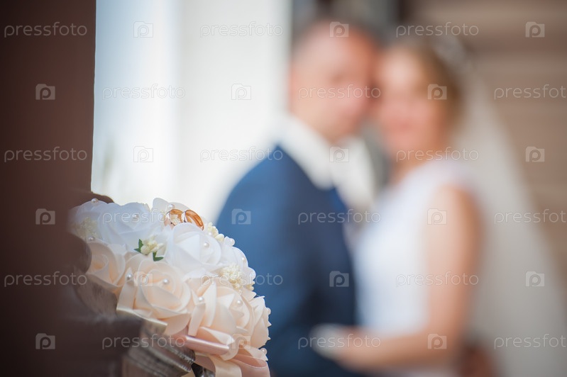 Свадебный букет невесты с обручальными кольцами крупным планом, фоновое изображение