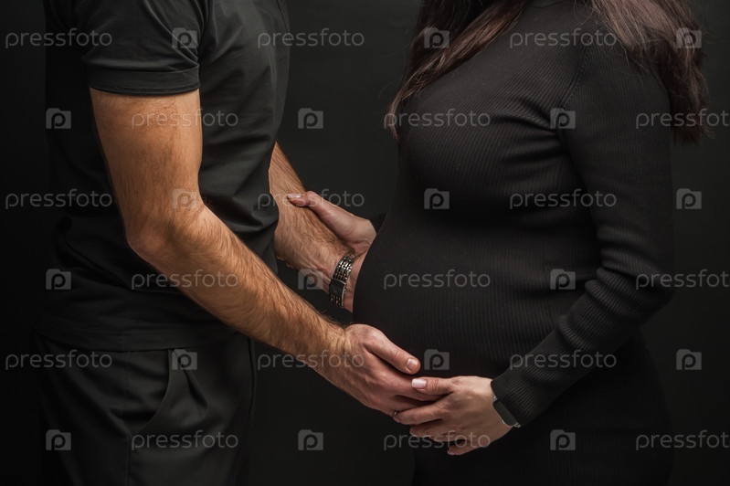 Мужчина и жена в позе 40 недель с большим животом, в черной одежде на белом, черном фоне, стоят