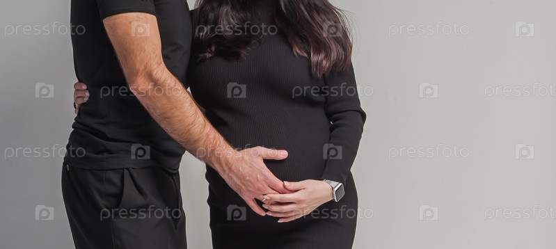 Мужчина и жена в позе 40 недель с большим животом, в черной одежде на белом, черном фоне, стоят