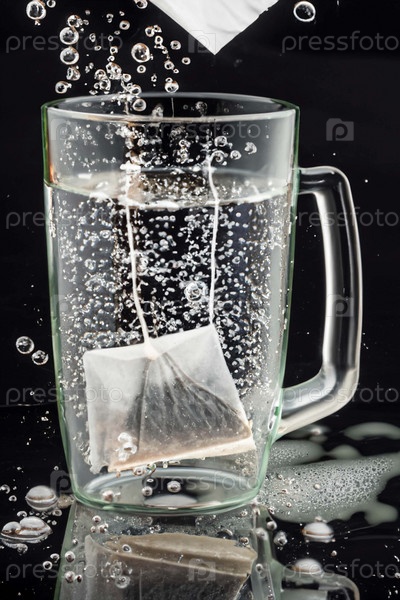 Чайный пакетик падает в чашку с горячей водой