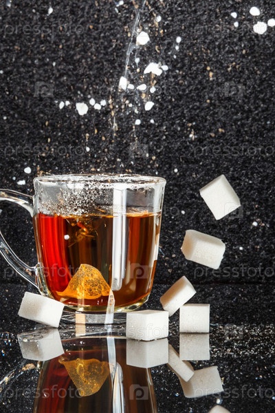 Чайный пакетик падает в чашку с горячей водой