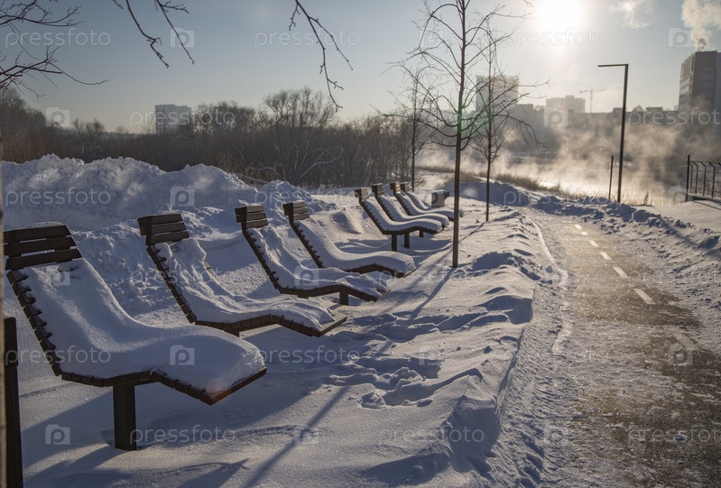 Дереянные кресла в снегу змним солнечным днем. Зона отдыха около зимней реки. Городской пейзаж зимой