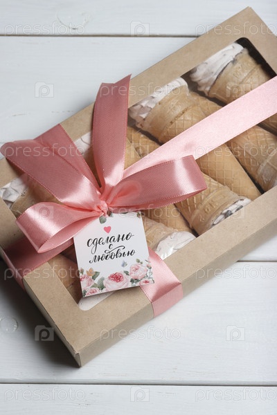 Вафельные рожки с зефиром в подарочной упаковке с прозрачной крышкой. Коробочка перевязана лентой, на которой прикреплены фирменные логотипы. Надписи на русском языке сделаны с любовью. Белый деревянный фон