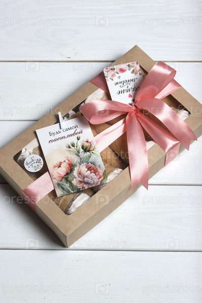 Вафельные рожки с зефиром в подарочной упаковке с прозрачной крышкой. Коробка перевязана лентой, к ней прикреплены фирменные логотипы и открытка. Надписи на русском языке будут самыми счастливыми и сделаны с любовью. Белый деревянный фон