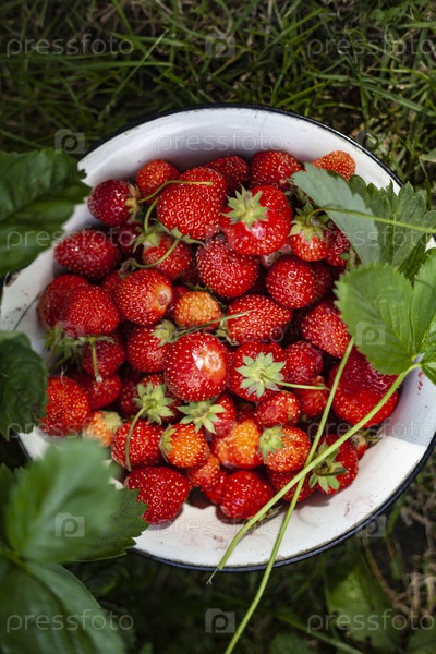 Летний натюрморт. Тарелка спелой садовой клубники, снятая сверху