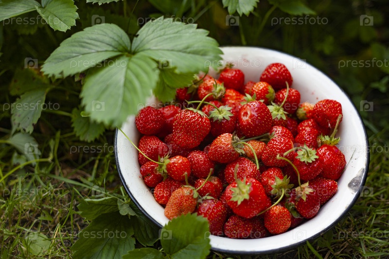 Летний натюрморт. Тарелка спелой садовой клубники, снятая крупным планом
