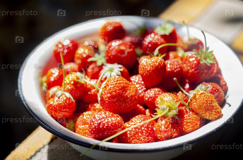 Летний натюрморт. Тарелка спелой садовой клубники, снятая крупным планом