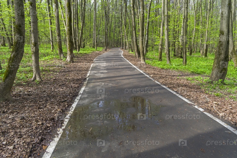 Асфальтированная пешеходная дорожка в лесопарке. Москва, Битцевский парк, Узкое, конец апреля, солнечно