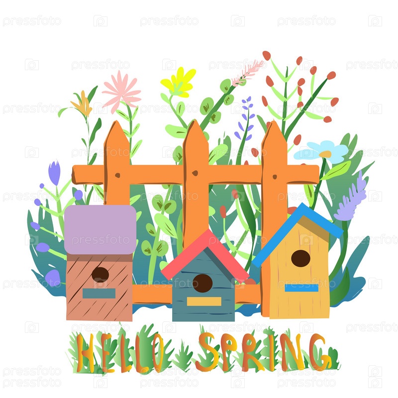 Весенний травяной забор и иллюстрация некоторых скворечников, привет весна