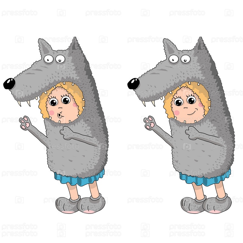 Иллюстрация маленькой рыжей девочки в костюме волка с зубами
