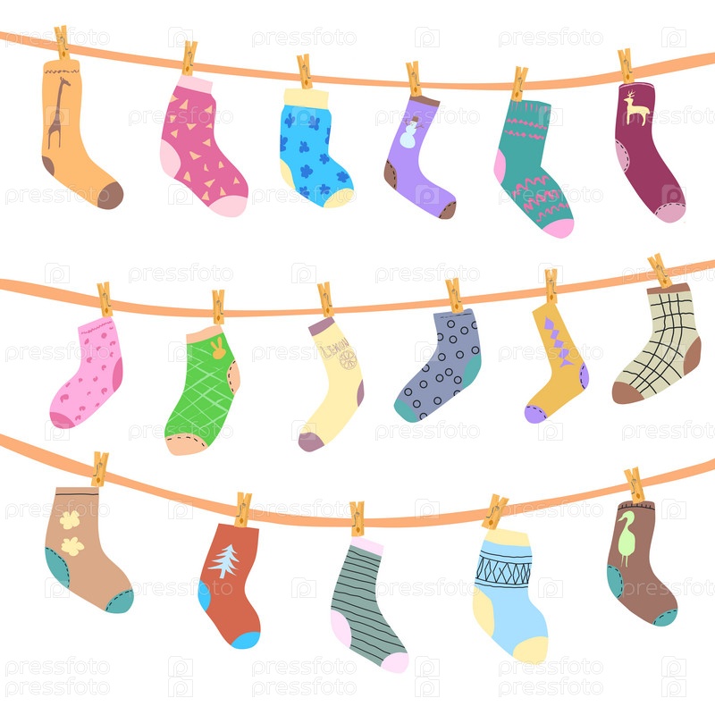 17 мультяшных носков разных форм и цветов после стирки висят на веревках с прищепками