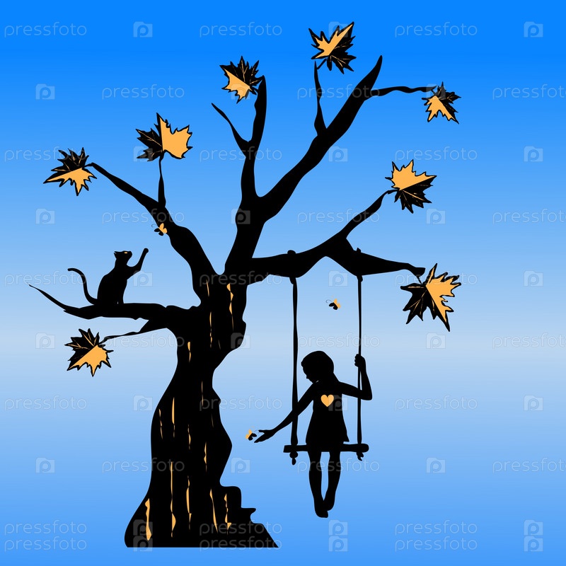 Иллюстрация стилизованного дерева и девушки на качелях