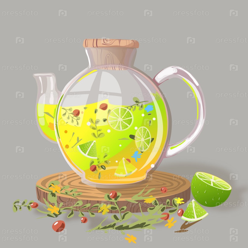 Иллюстрация чайника, заваренного лимонно-ягодным напитком, ломтиками лимона и сухофруктами