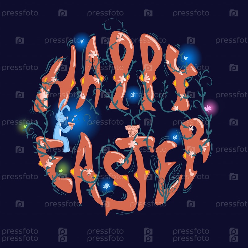 Пасхальная открытка с цветами и пасхальным кроликом