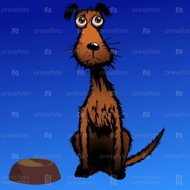 Персонаж голодной собаки жалобно смотрит рядом с пустой тарелкой