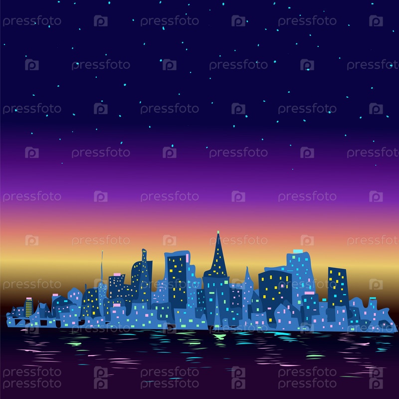 Большой светящийся город вдалеке на закате