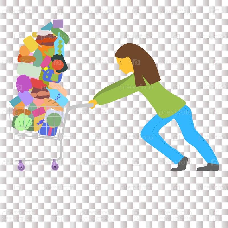 Женщина с усердием толкает к кассе полную перегруженную корзину с едой