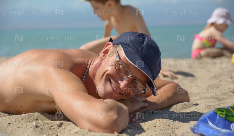 Парень лежит на пляже и загорает