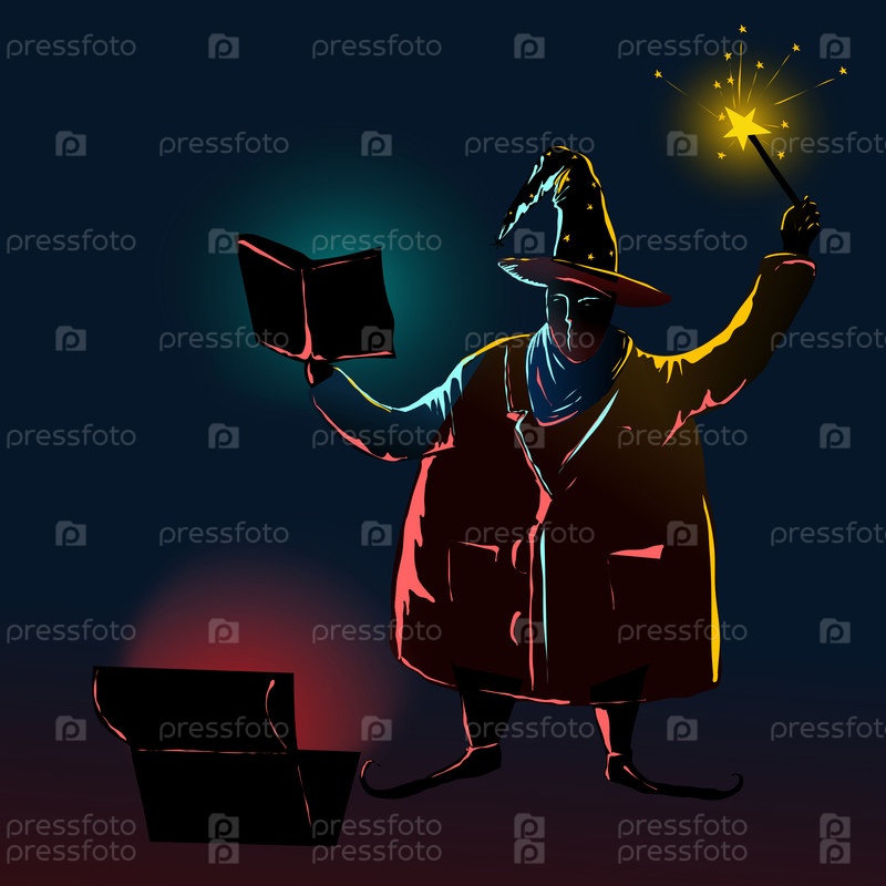 Стилизованное изображение толстого черного волшебника, колдующего волшебной палкой и открывающего волшебную книгу