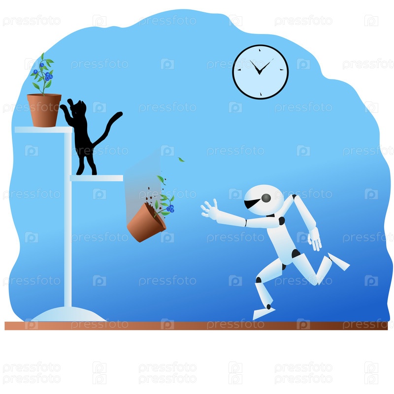 Иллюстрация домашнего робота, пытающегося схватить цветок, уроненный кошкой