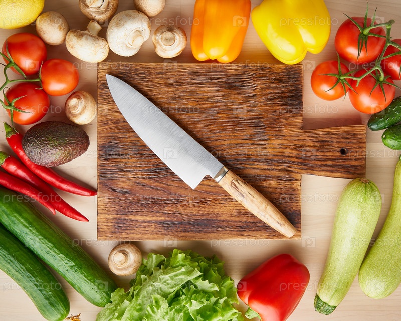Овощи вокруг деревянной разделочной доски с ножом на кухонном столе. Вид сверху