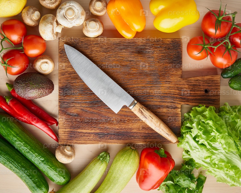 Овощи вокруг деревянной разделочной доски с ножом на кухонном столе. Вид сверху