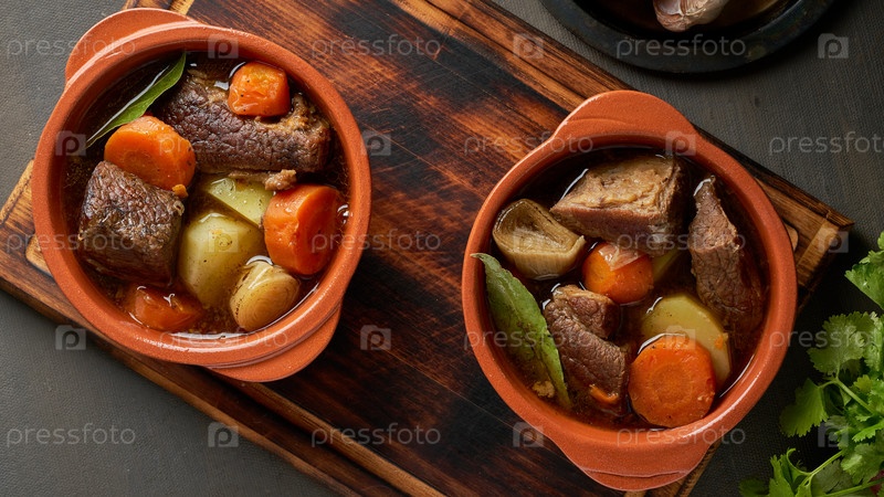 Гуляш с крупными кусочками говядины и овощами. Мясо по-бургундски. Медленное тушение. Вид сверху