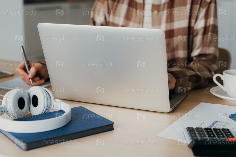 Интернет-покупки, онлайн-обучение, работа на дому. Дистанционное обучение. Женщина печатает в блоге на ноутбуке. Фрилансер, концепция цифрового кочевника