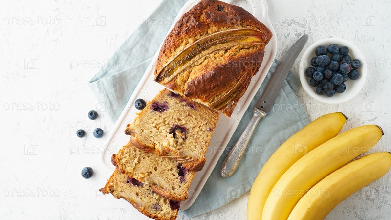Домашний банановый хлеб. Испеченный пирог. Вид сверху, белый стол. Традиционная американская кухня. Кусок хлеба. Копировать пространство