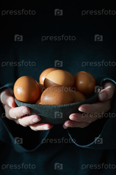 Необычная Пасха на темном фоне. Миска коричневых яиц руками. Темнота, лучи солнечного света освещают яйца. Концепция новой жизни, возрождения. Деревенский стиль. Вертикальное пространство для копирования