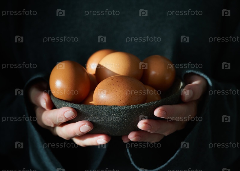 Необычная Пасха на темном фоне. Миска коричневых яиц руками. Темнота, лучи солнечного света освещают яйца. Концепция новой жизни, возрождения. Деревенский стиль. Вид сбоку, пространство для копирования