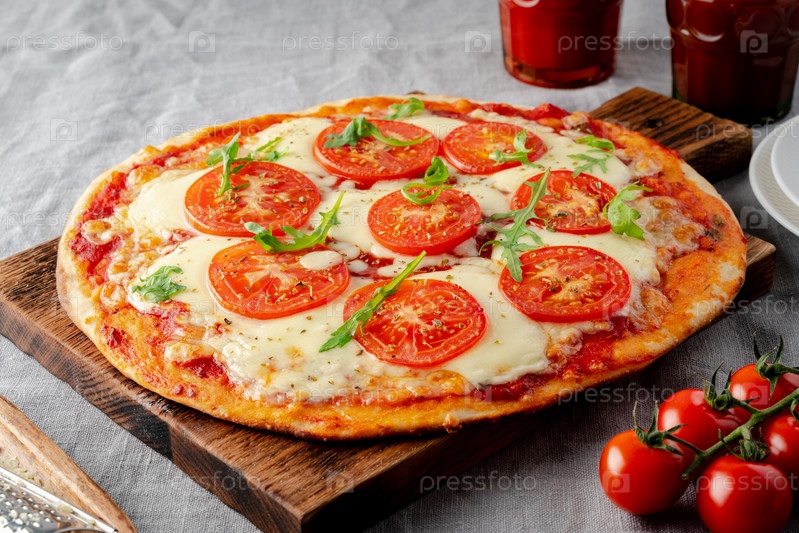 Деревенское итальянское домашнее тесто для пиццы Маргарита с соусом для пиццы из консервированных помидоров, сыра моцарелла и рукколы на темной льняной текстильной скатерти, вид сбоку