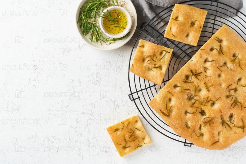 Фокачча, пицца, итальянская лепешка с розмарином и оливковым маслом на решетке на белом деревенском столе, традиционная итальянская кухня, вид сверху, пространство для копирования