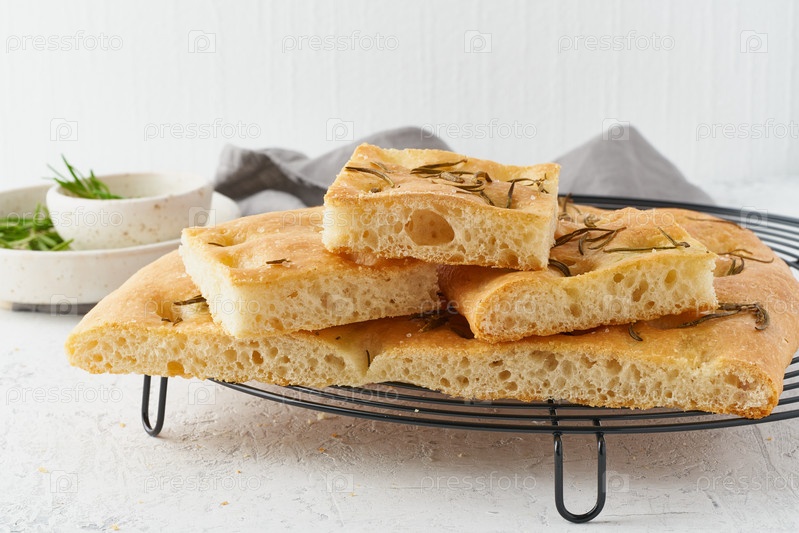 Фокачча, пицца, итальянская лепешка с розмарином и оливковым маслом на решетке на белом деревенском столе, традиционная итальянская кухня, вид сбоку, крупный план