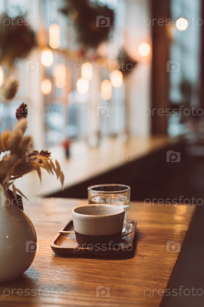 Чашка кофе эспрессо и стакан воды на деревянном столе возле окна в уютном маленьком кафе