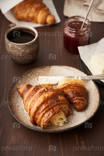 Утренний завтрак с круассаном на тарелке, чашкой кофе, джемом и маслом. Вертикальный, вид сбоку