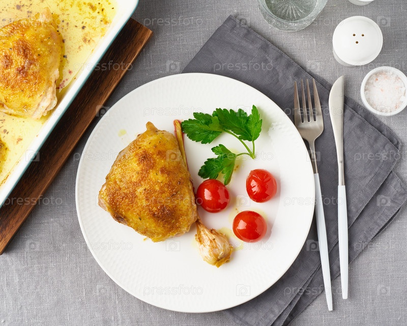 Куриные бедра, запеченные с куркумой, помидорами и чесноком. Жареная курица на тарелке, серая скатерть, поднос с мясом. Здоровое питание, чистое питание, палео, кето, кетогенная диета