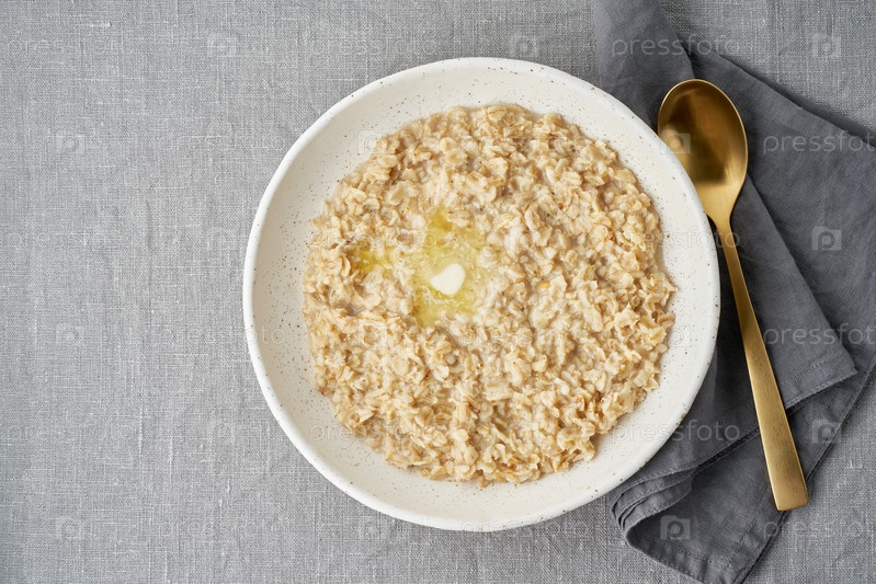 Цельная овсянка, большая тарелка каши с маслом на завтрак, утренний прием пищи
