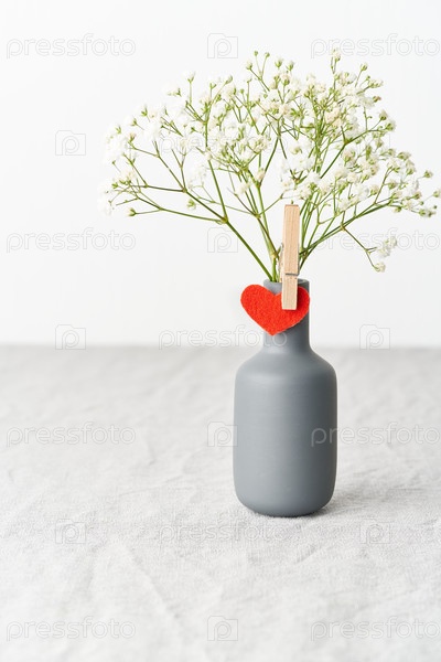 День святого Валентина. Нежные белые цветы в вазе. Красное фетровое сердце – символ влюбленных. Светло-белый нежный пастельный фон. Скандинавский минимализм. Вид сбоку, пространство для копирования, вертикальное