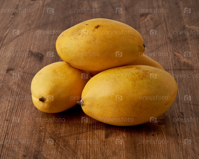 Четыре целых фруктовых манго на деревянном столе. Большие сочные ярко-спелые желтые плоды на темном фоне