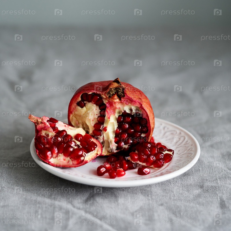 Натюрморт с разбитым открытым гранатом и семенами на тарелке на столе, покрытом мятой серой скатертью, при естественном свете из окна. Фотография образа жизни с ярко-красным центром на нейтральном фоне