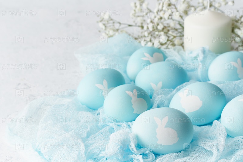 Пасха. Праздничный день. Светлый белый фон, нежные пастельные тона. Голубые яйца с изображением кролика в корзине. Цветы на заднем плане, вид сбоку, пространство для копирования
