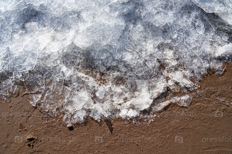Лед на пляже. Граница зимы и лета. Лед и песок. Холодный и теплый. Контрастный переход